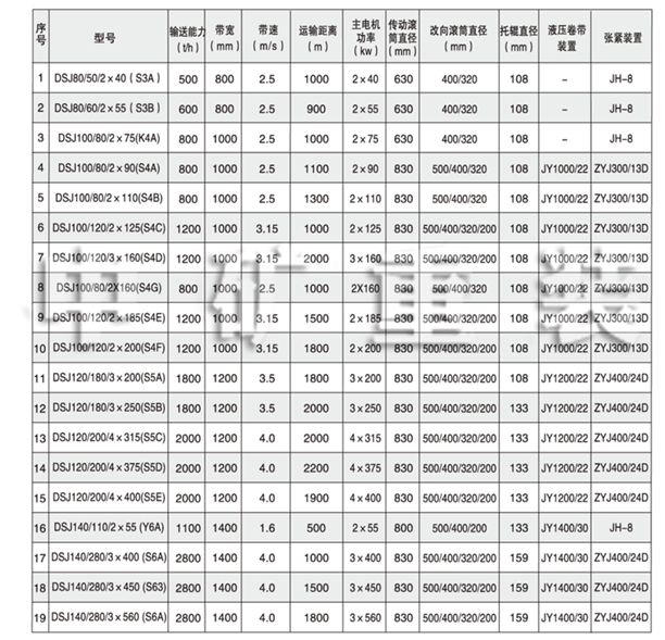 DSJ型可伸縮帶式輸送機主要用于煤礦井下綜采、高檔普采或一般普采工作面的順槽運輸,也可用于巷道掘進運輸。其同時也可用于其他礦山、化工、冶金和港口碼頭等運距變化的場合進行物料運送。其主要特點是機尾可隨著工作面推移而自行移動,可延伸或收縮其運送距離。輸送機結構緊湊,可不設基礎,可直接在巷道底板上鋪設,也可懸吊在巷道的頂板上,機架輕巧,機架間可不用螺栓聯結,采用“E”形銷或彈性圓柱銷聯接,拆裝十丹方便。輸送帶采用整芯帶,用機械接頭聯結。若輸送能力和運距較大時,可配中間驅動裝置來滿足物料輸送要求。其功能除具有可控的軟起動、功率平衡和輸送帶張力自動調控等以外,特別配置了嚴格的監測、傳感系統和可靠的安全保護設施。