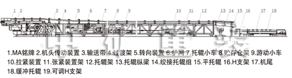 落地側裝式鋼架為機身,上托輥組間距為1 2或1 5米,下托輥組間距為3米。托輥組設有前后調整位置,通過調整托輥組位置來調整輸送帶的跑偏。托輥均采用沖壓軸承座托輥,設有雙重密封,具有重量輕、密封性能好、旋轉阻力小、使用壽命長等特點。